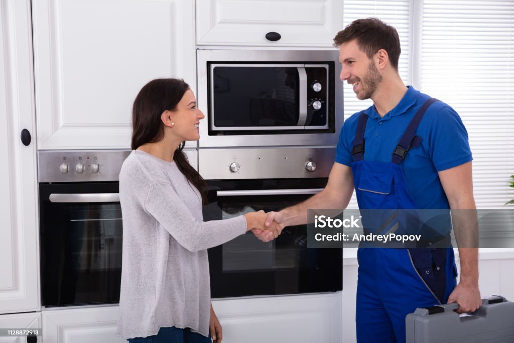 Smiling Young Male Serviceman Shaking Hands With Happy Woman